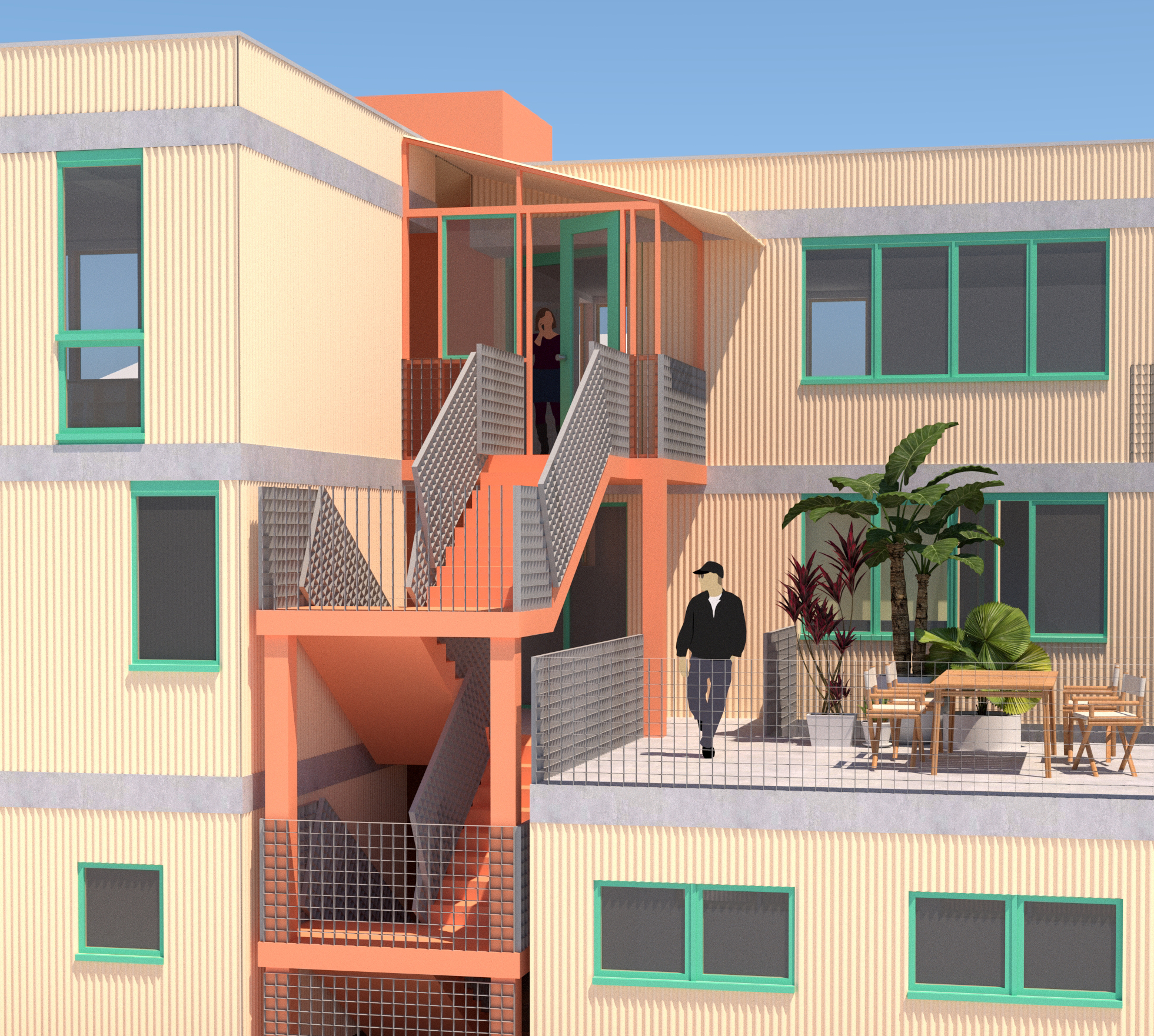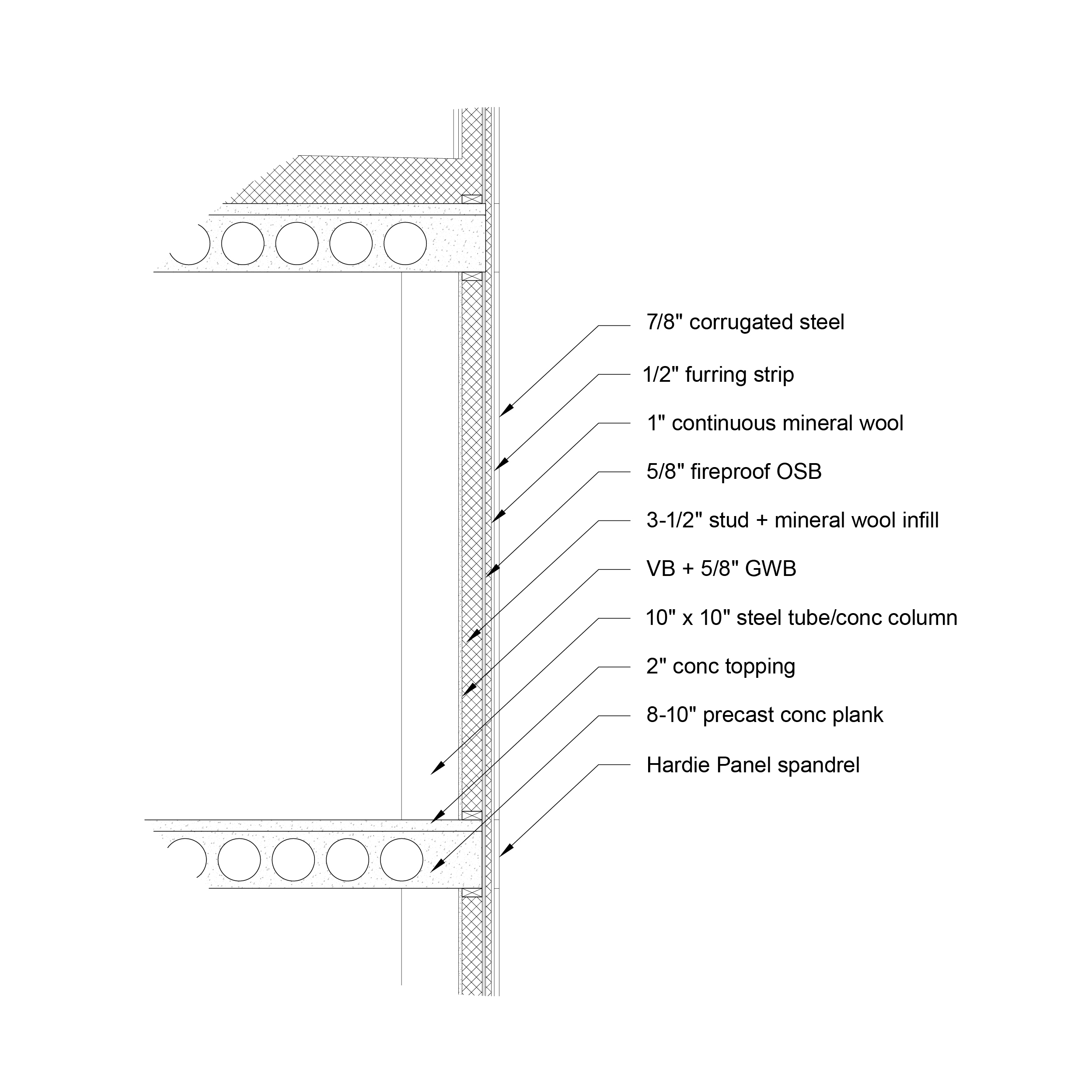Structurally, the design uses a prefabricated system of fireproof steel columns, beams, and concrete planks that create flexibility upfront and long term. The planks offer excellent acoustic separation and also provide a ceiling finish. A higher material cost for this proven system is balanced by rapid assembly, low maintenance, and an inexpensive 2x4 infill envelope. This basic fire-rated wall type can be either panelized offsite or built in the field by any construction crew. Continuous insulation over slab edges reduces operational energy costs, aided by a massing that allows cross-ventilation throughout.