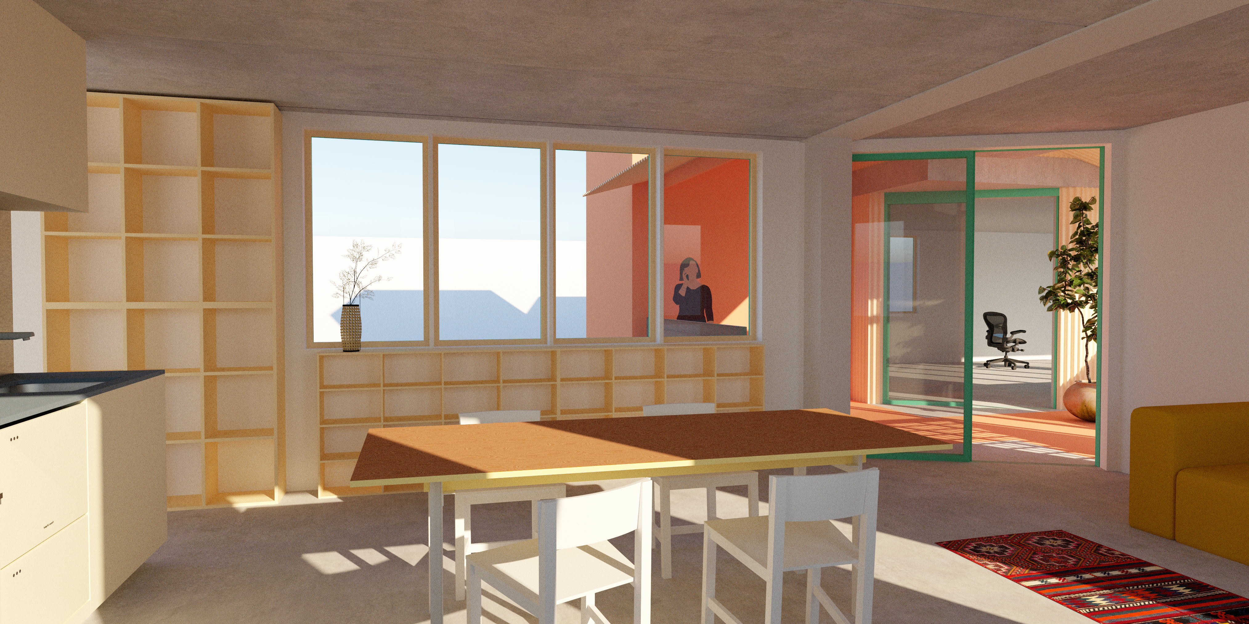 How big is a family? What should define one? Who might want to be a resident and renter in Marfa, and what kind of architecture could best serve their desire to live and work in close proximity? How much space do they need? Provoked by these questions, our proposal for the Design Marfa Multi-Family Housing Competition is an approach that can expand and contract for many different kinds of lifestyle. This “incre-rental” strategy is created through in effect splitting an apartment into two parts that can function independently. With this split made by a patio that provides a great place to hang out, as well as visual, acoustic, and psychological separation, the two parts can be rented separately or together depending on the needs of a given household. All kitchen equipment is electrical, allowing easy removal to facilitate alternative uses.