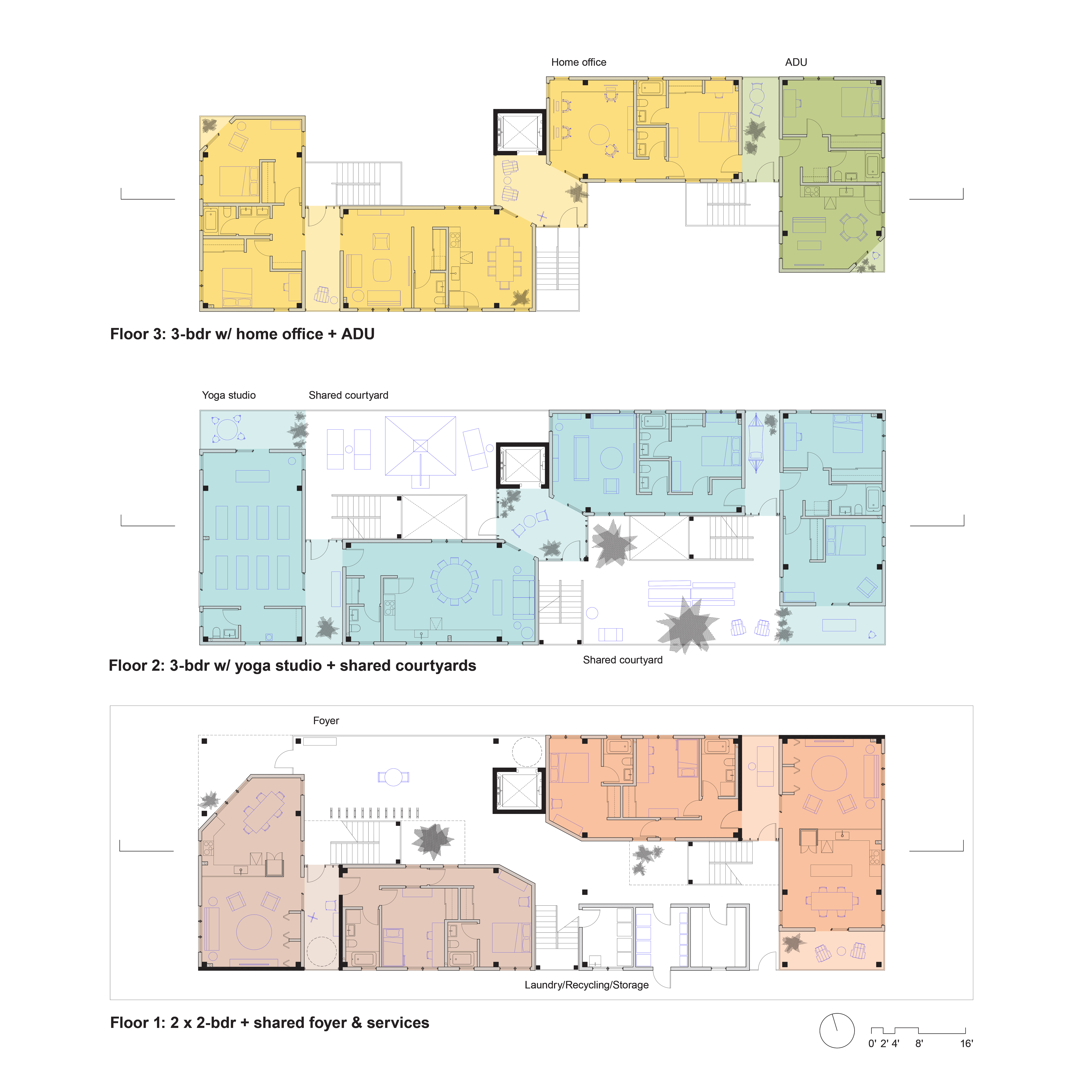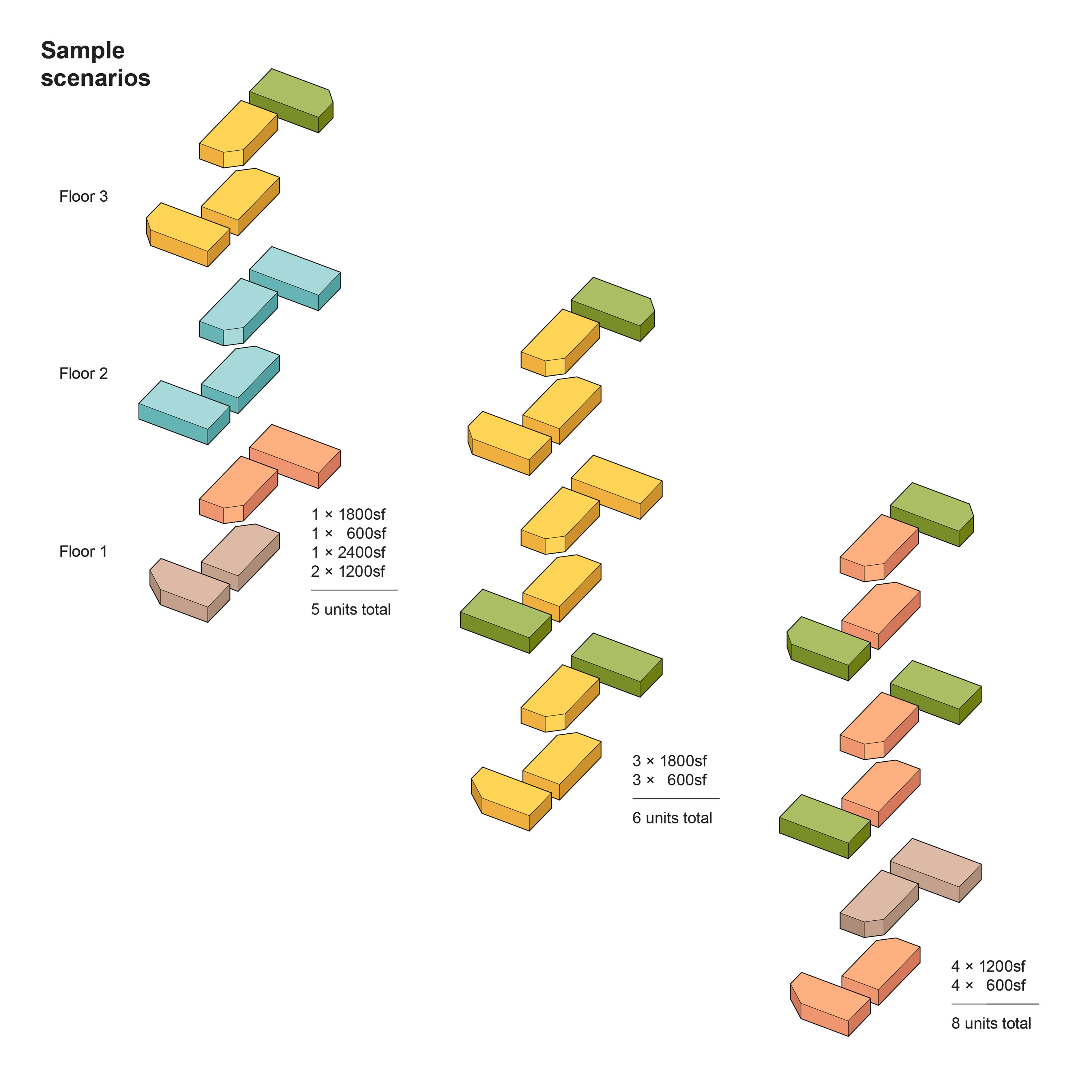 Unlike townhouses organized on stacked floors, this proposal’s dwellings operate on a single level, formed by 600sf modules. Linkable by covered balconies, these modules enable variable home sizes of 600, 1200, 1800, or 2400sf. This flexible unit concept supports both live/work situations (commute across a balcony) and also elderly and others benefitting from homes on a single level. All of the upper units and shared courtyard deck can be served by an elevator optimized for three-story buildings. Overall, the ethos of this cooperative project is that residents determine their unit types rather than unit types determining residents. Porous circulation allows for various comings and goings. While atypical in operation, the design works within familiar zoning, such as the appearance of four small-lot townhouses (as-of-right to the plot) with regulation dimensions. The design could have a maximum of eight units.