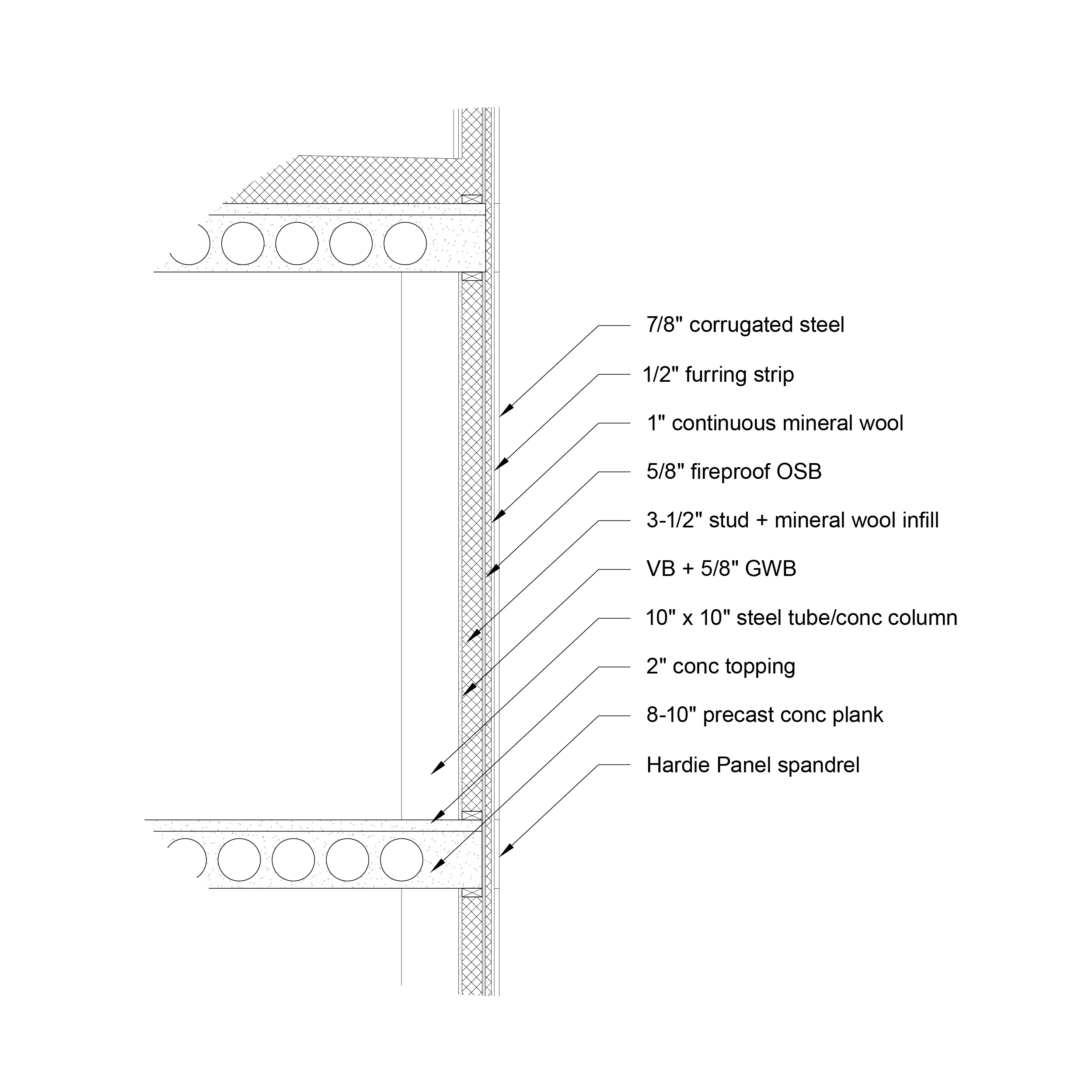 Structurally, the design uses a prefabricated system of fireproof steel columns, beams, and concrete planks that create flexibility upfront and long term. The planks offer excellent acoustic separation and also provide a ceiling finish. A higher material cost for this proven system is balanced by rapid assembly, low maintenance, and an inexpensive 2x4 infill envelope. This basic fire-rated wall type can be either panelized offsite or built in the field by any construction crew. Continuous insulation over slab edges reduces operational energy costs, aided by a massing that allows cross-ventilation throughout.