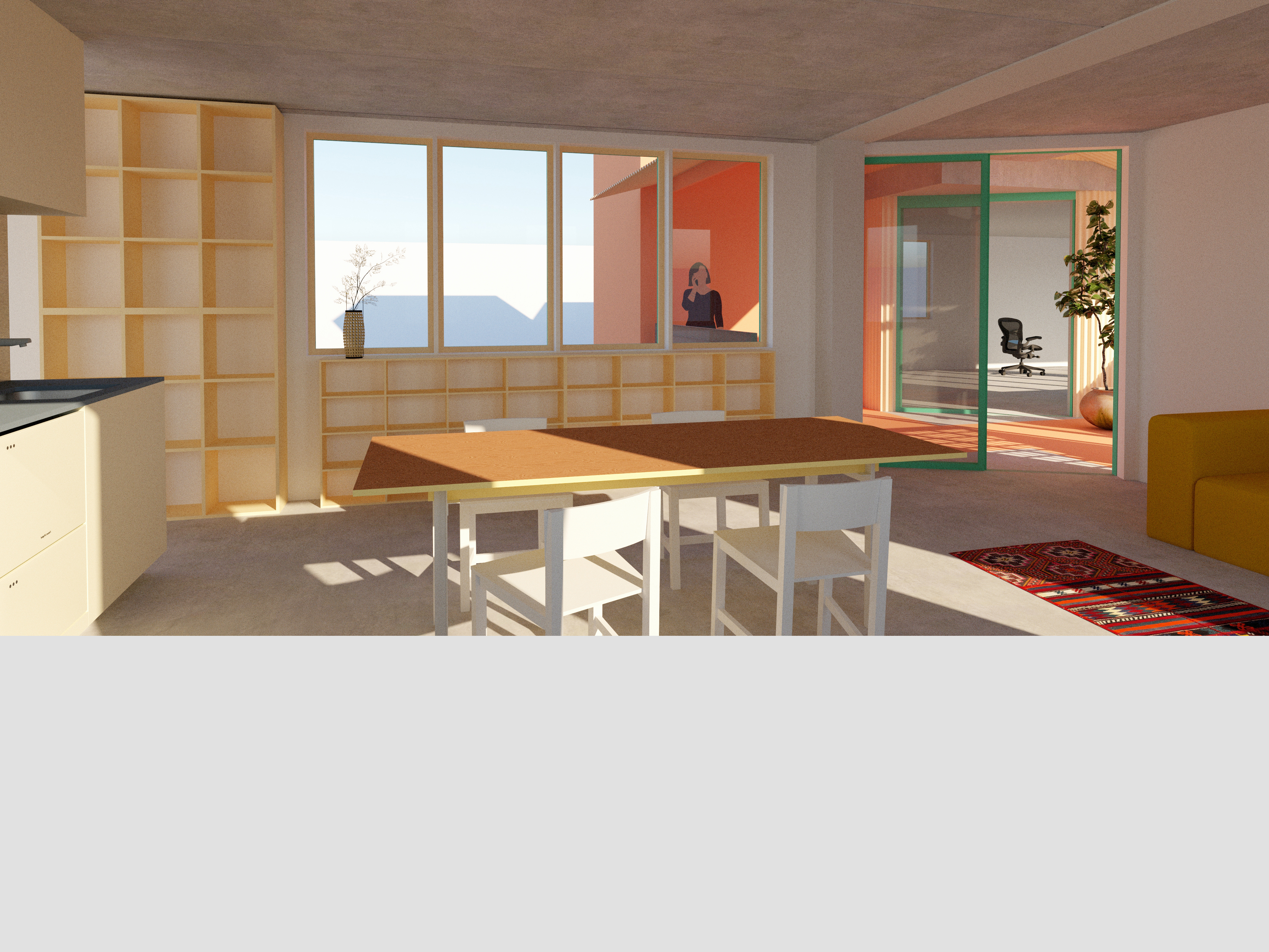 How big is a family? What should define one? Who might want to be a resident and renter in Marfa, and what kind of architecture could best serve their desire to live and work in close proximity? How much space do they need? Provoked by these questions, our proposal for the Design Marfa Multi-Family Housing Competition is an approach that can expand and contract for many different kinds of lifestyle. This “incre-rental” strategy is created through in effect splitting an apartment into two parts that can function independently. With this split made by a patio that provides a great place to hang out, as well as visual, acoustic, and psychological separation, the two parts can be rented separately or together depending on the needs of a given household. All kitchen equipment is electrical, allowing easy removal to facilitate alternative uses.